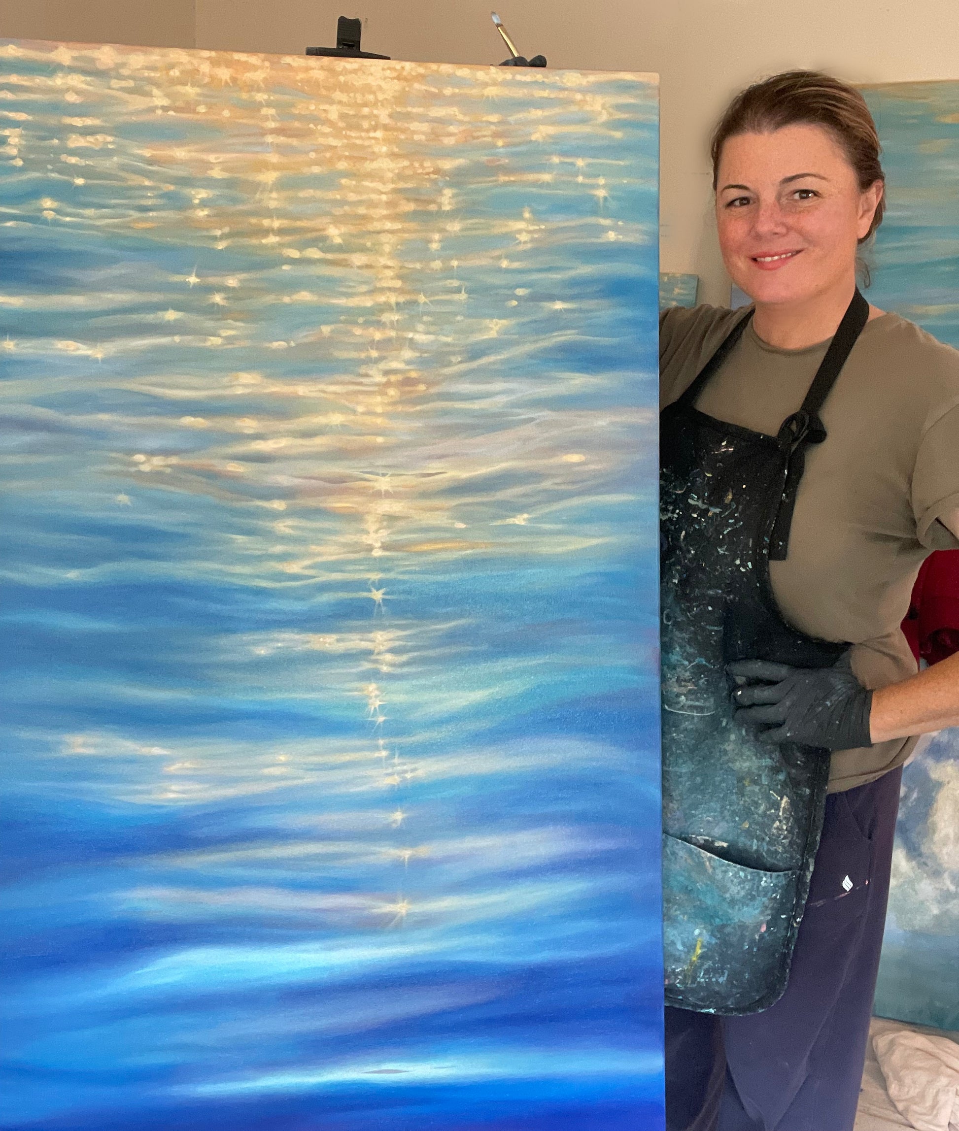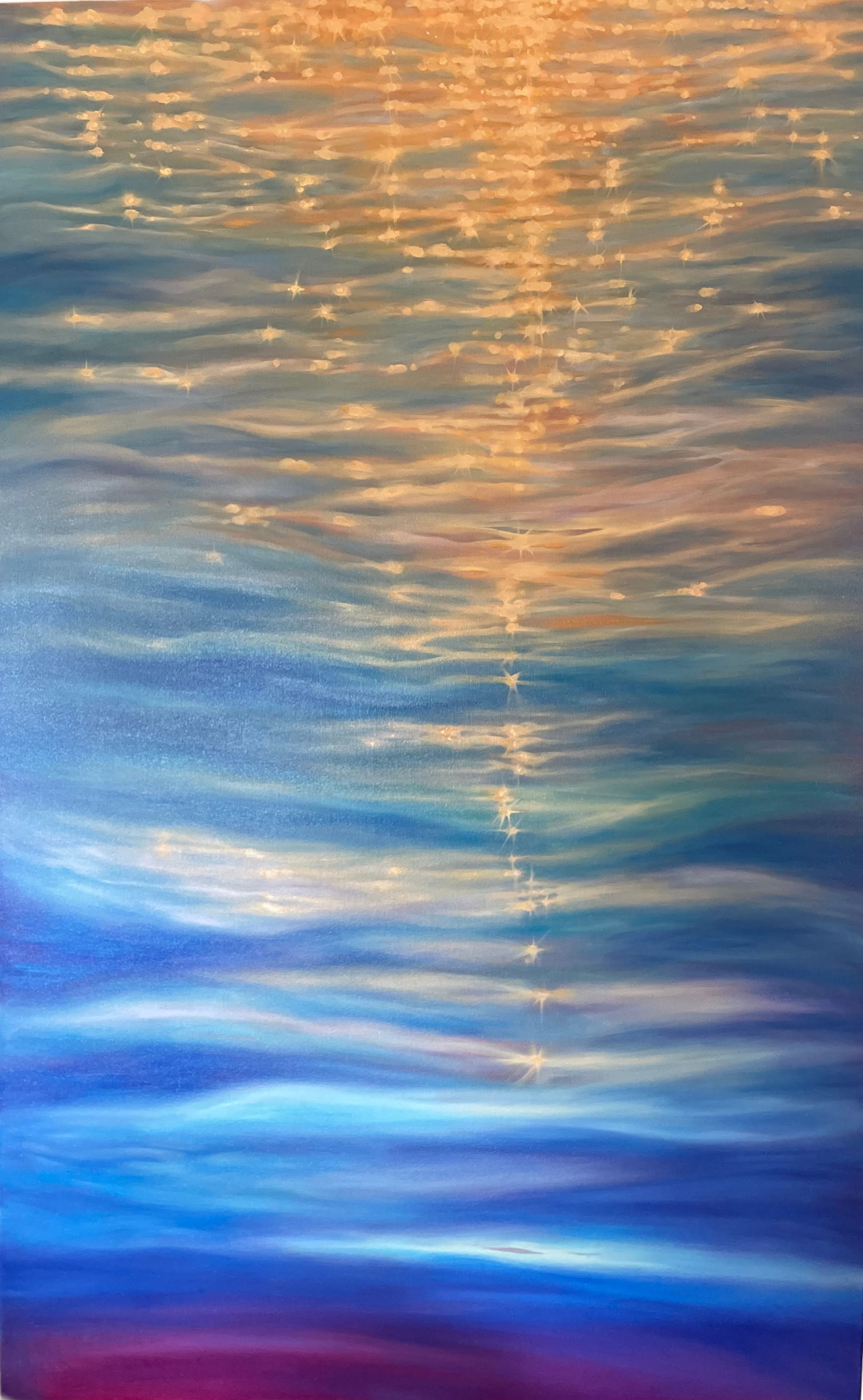 A soothing original painting of the ocean and the reflection of the sun sparkling on the surface of the water from the 'Ocean Bliss' series de Camille. This artwork is intended to help you relax and feel serene.
