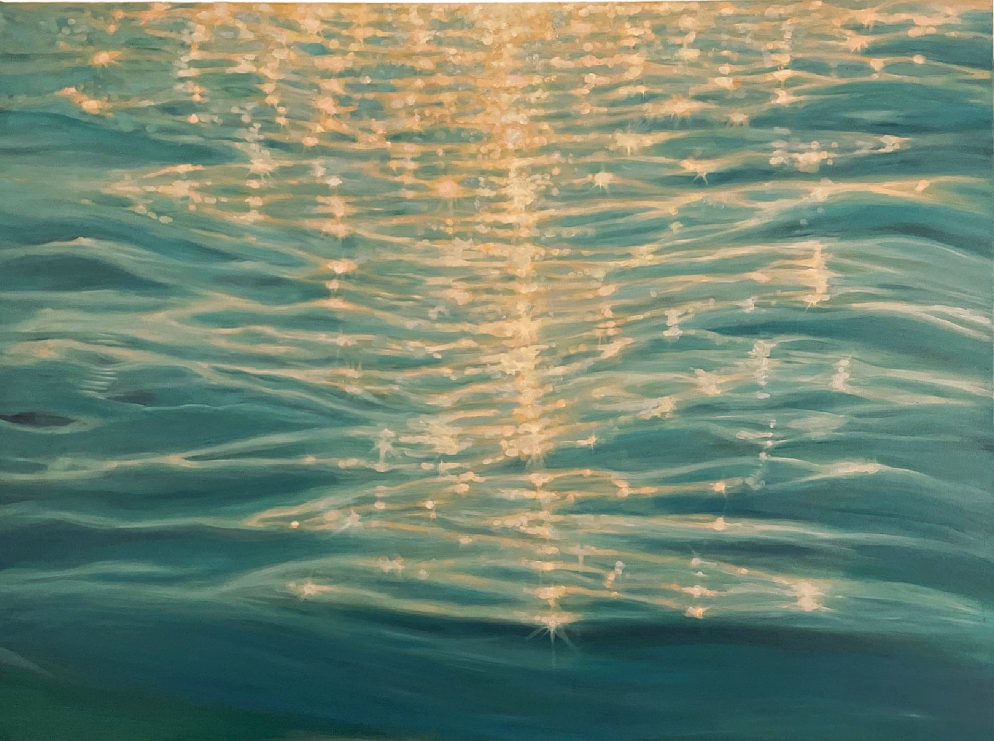 A soothing original painting of the ocean and the reflection of the sun sparkling on the surface of the water from the 'Ocean Bliss' series de Camille. For the second time, de Camille experimented with adding real diamonds to this piece giving it an even more luxurious sparkle. This artwork is intended to help you relax and feel serene.