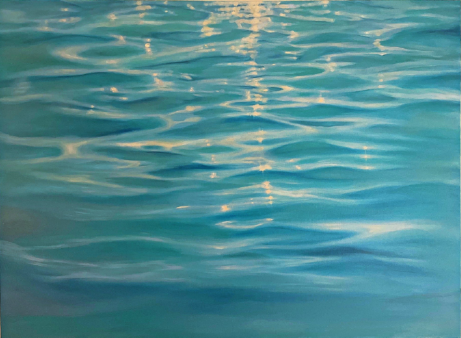 A soothing original painting of the ocean and the reflection of the sun sparkling on the surface of the water from the 'Ocean Bliss' series de Camille. This artwork is intended to help you relax and feel serene.