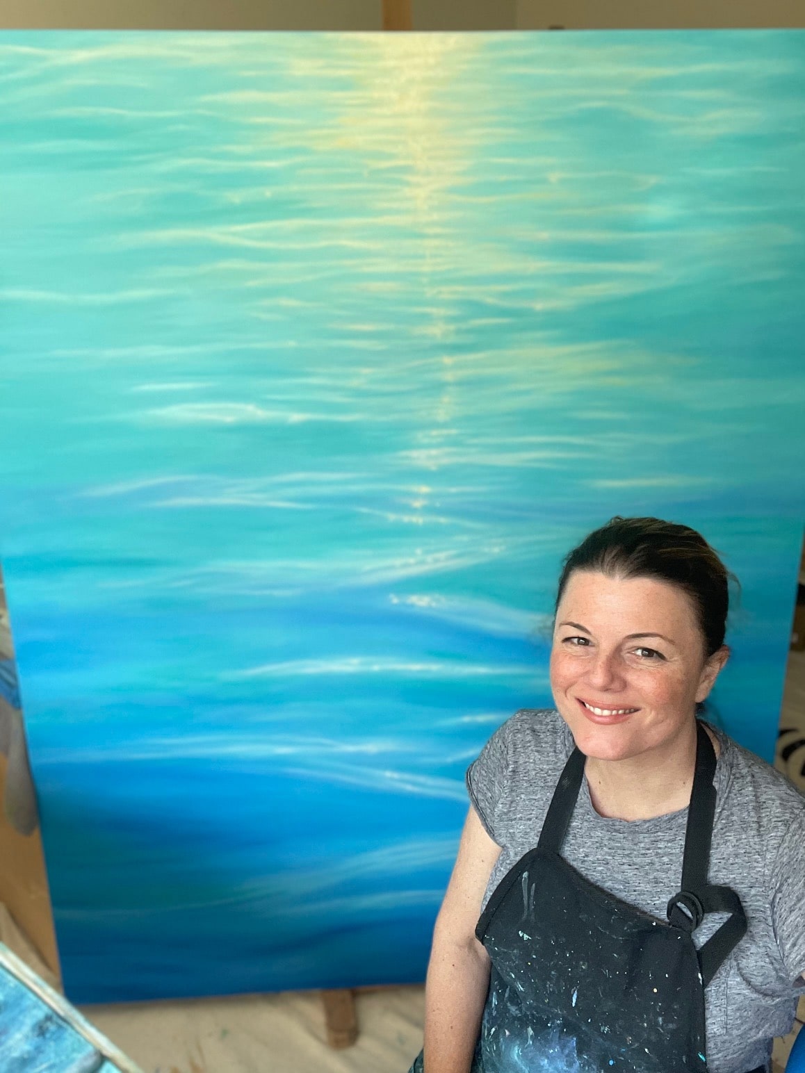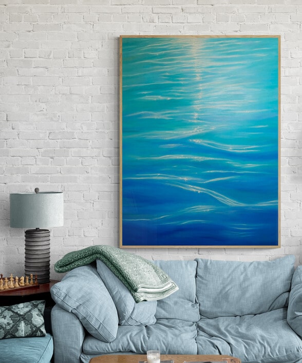 A soothing original painting of the ocean and the reflection of the sun sparkling on the surface of the water from the 'Ocean Bliss' series de camille. This artwork is intended to help your relax and feel serene.